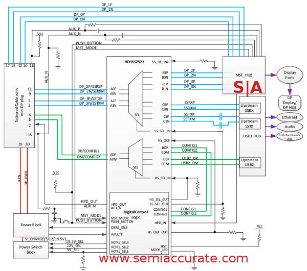 If you make a docking station using DockPort as the standard it is both simple and low-cost starting with a $1.85 HD3SS2521. Add in some power circuitry to feed DC across it to the laptop if you want, or you can just plug your laptop’s power brick in to the controller and run a couple of wires. If you do that the cost is pennies for the internal cable and physical DC connector. The video signal is vanilla DP1.2 so you can simply run three monitors off of it with DP1.2 or if you want to be fancy put in an active converter to VGA, HDMI, or DVI for a few dollars. Throw in a $1-2 USB3 hub like the VIA VL812 plus a button and blinky light controller and you are looking at $10 or so, double that end-user price, for a passive DockPort docking station with one cable. Note that this is around half of a .5m Thunderbolt cable or far less than the cost of an optical Thunderbolt cable for a fancy active one that mates to your laptop. If you look at the wiring diagram in the TI datasheet, you can see why it isn’t going to be expensive to make these things.