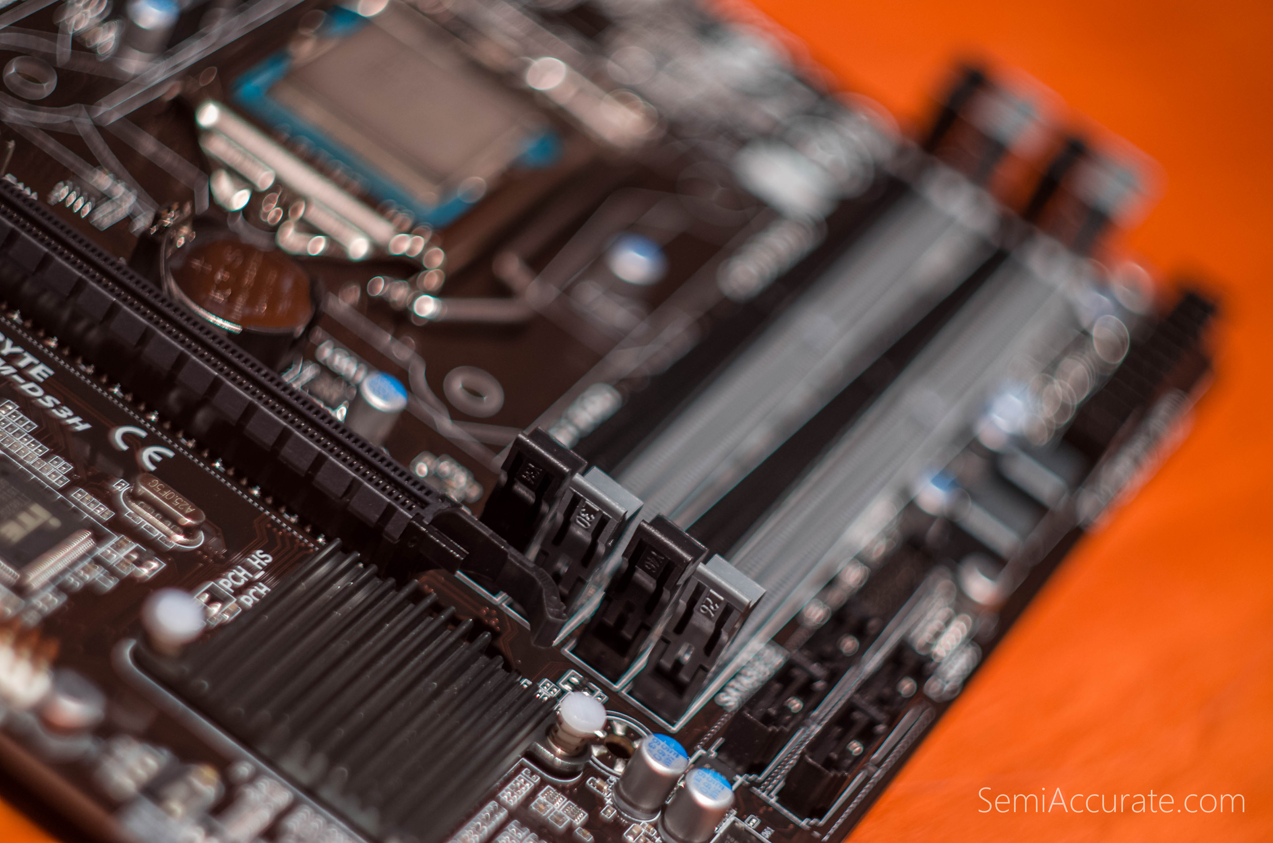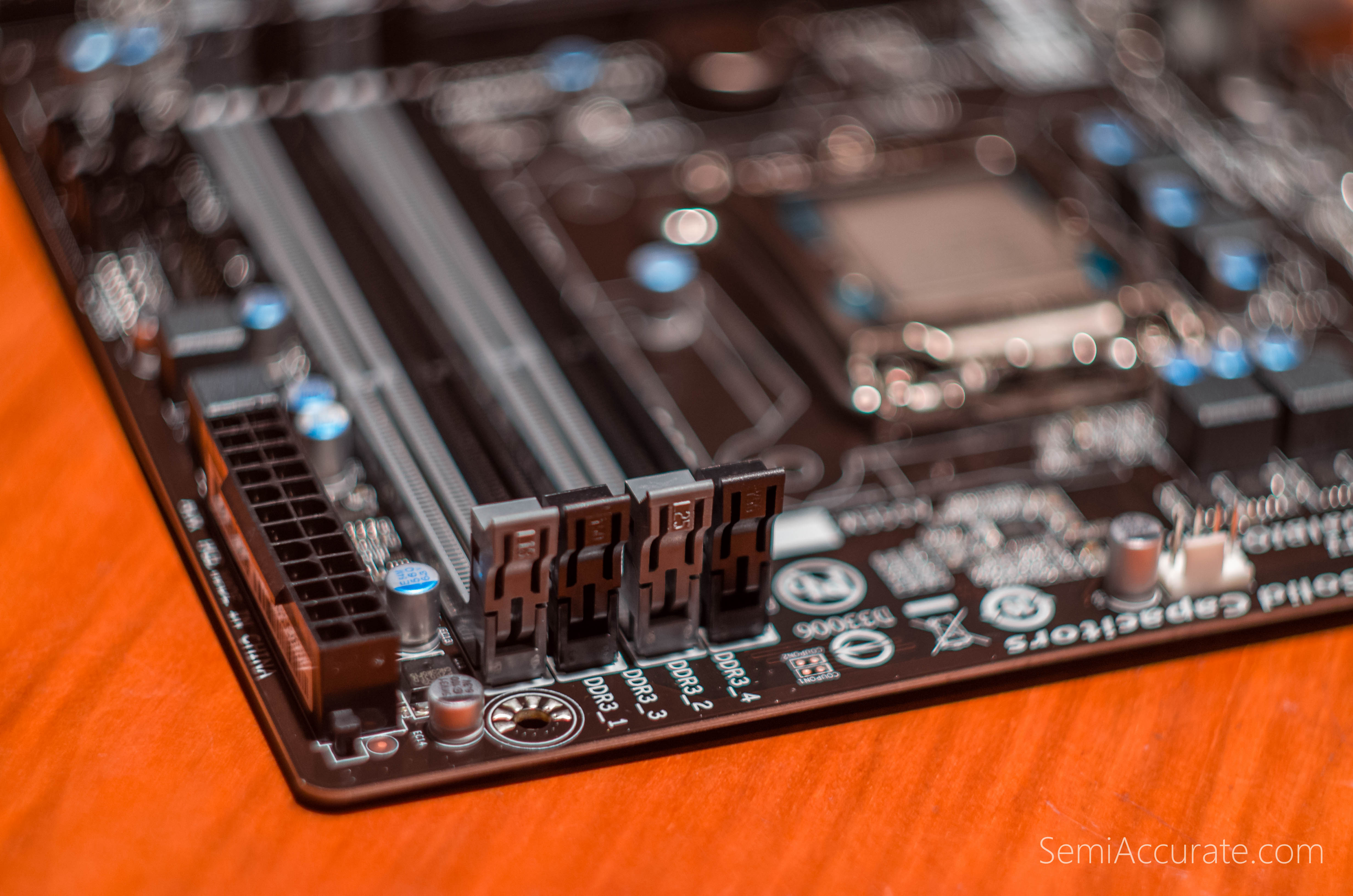 The memory DIMMS, SATA ports and PCI-E x16 slot all converge just off from the center of the GA-Z97M-DS3H. But even when there’s a graphics card, CPU cooler, memory DIMMs, and SATA cables there’s still plenty of clearance between all of those items.